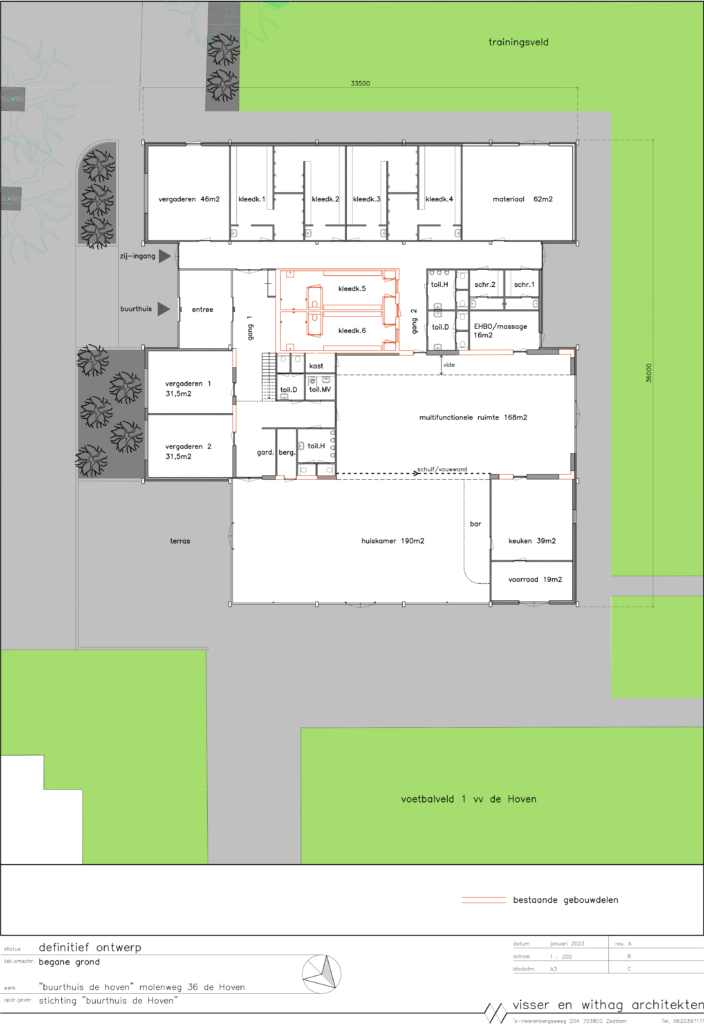 In 2022 zijn in samenspraak met de architect en de aannemer een aantal aanpassingen gedaan die het gebruik van de accommodatie sterk verbeteren en bovendien een flinke besparing opleveren in de bouwkosten. Ook heeft het gebouw een veel mooiere uitstraling gekregen.